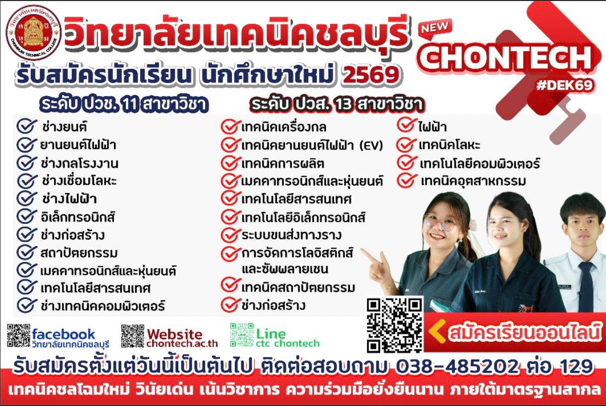 ประกาศรายชื่อนักเรียน นักศึกษา (รอบโควตา สถานศึกษาส่งมาและสมัครออนไลน์) ที่มีสิทธิ์รายงานตัว เข้าศึกษาต่อ ที่วิทยาลัยเทคนิคชลบุรี ประจำปีการศึกษา 2569 ![]()